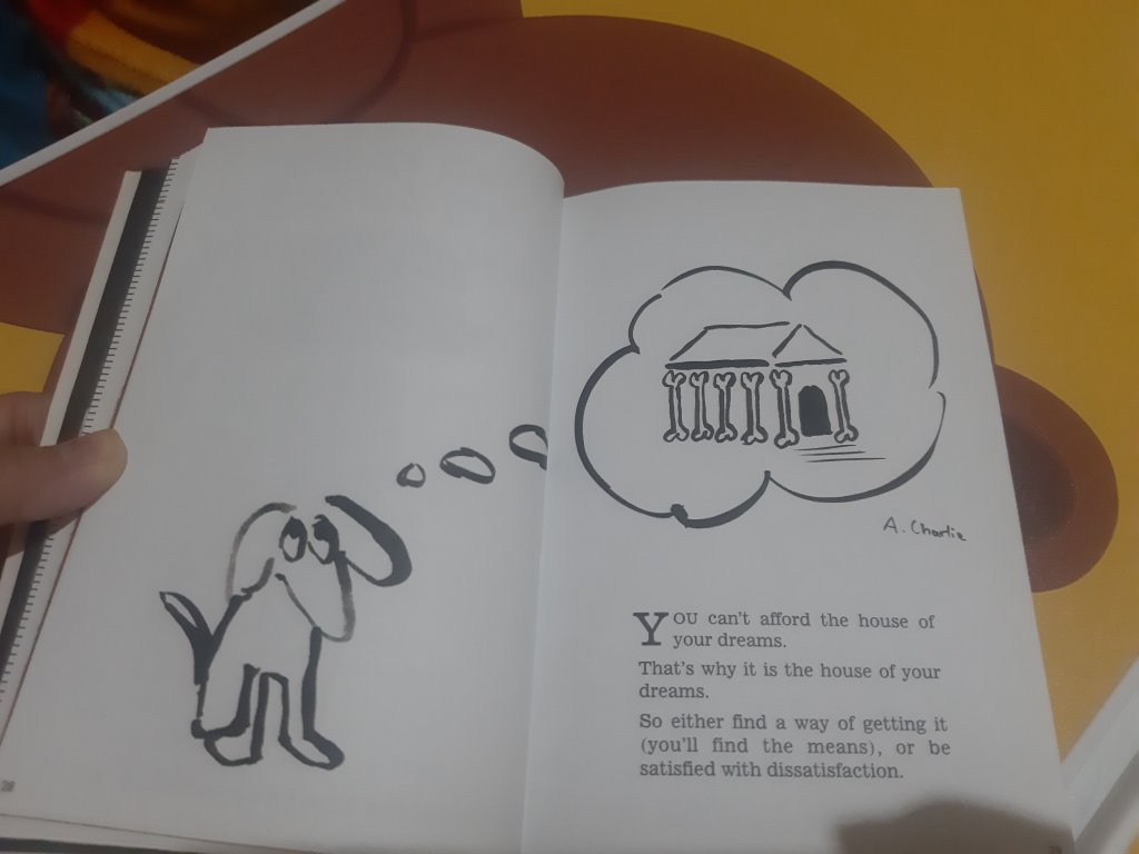 On another page, I wasn’t a fan of his idea that a dream house couldn’t be afforded, and that if someone had it, it meant it wasn’t really their dream house (pretty cliché, right?). But Arden kind of redeemed himself with the illustration he used: a black-and-white drawing of a dog imagining a house made of bones. At first, I thought the bones were the dog’s, meaning the house would only be built after the dog’s death. But then I considered that the bones could have been the dog’s favorite food or things, and the house would have been made out of the things the dog loved. That’s how the book let readers interpret things in their own way.