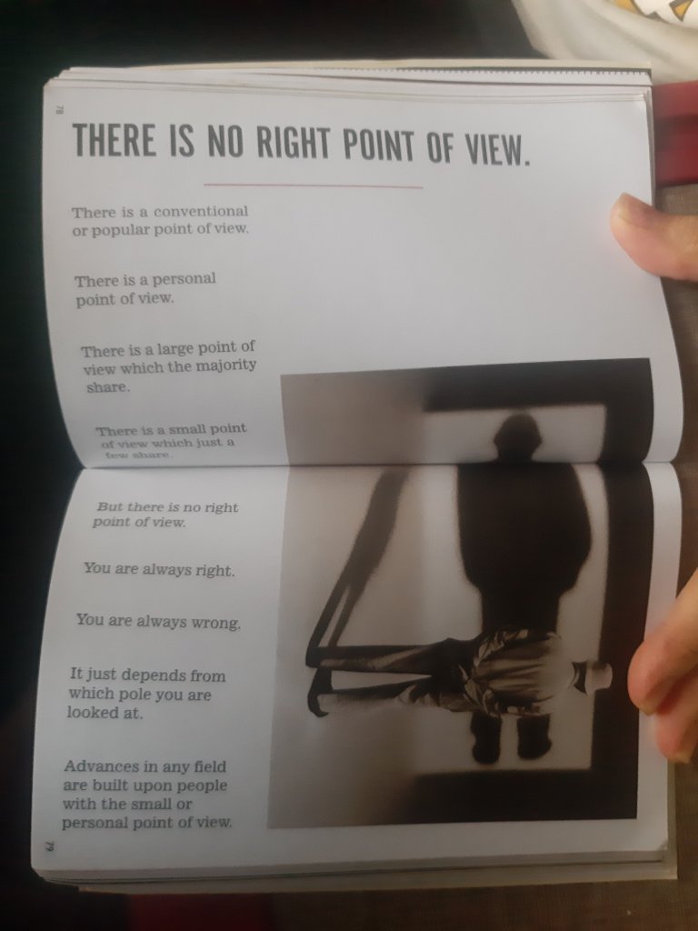 At this point, I realized that what was inside this book wasn’t just about motivation—or maybe it wasn’t about motivation at all. It was about creative thinking in psychology, something I only became aware of during my second read-through. I looked over the very first page, and it was written, “Let us start off on the right foot by making some wrong decisions” on a black background, with a small footnote illustration of a guy stepping forward with his right foot, accompanied by an arrow symbol. How did I not notice that the first time I finished the book?